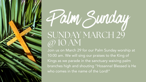 Join us on April 13th for our Palm Sunday worship at 10:00 am. We will sing our praises to the King of Kings as we parade in the sanctuary waiving palm branches high and shouting “Hosanna! Blessed is He who comes in the name of the Lord!” After worship, our annual Easter Egg Hunt and Celebration will take place at 3:00 pm. Click here to register and learn more.