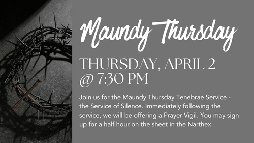 Join us for the Maundy Thursday Tenebrae Service on Thursday, April 17th at 7:00 pm. Immediately following the service, we will be offering a Prayer Vigil. You may sign up for a half hour on the sheet in the Narthex or by clicking here