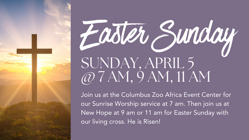 Our worship on Easter Sunday begins at 7:00 am at the Africa Event Center in the Columbus Zoo with the Easter Sunrise Service. Everyone is welcome! To access the Africa Event Center, simple drive to New Hope Church. Ushers will be present to direct you past our parking lot, to the Event Center Parking lot. Please do not use the main Zoo entrance. Handicap parking is available. Contact our front desk with any questions or concerns.